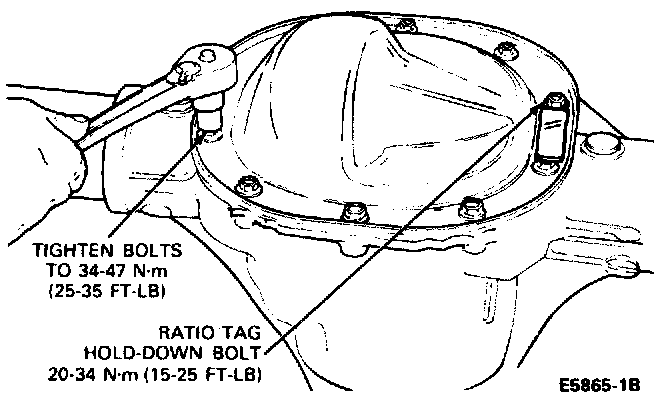 4. Install cover and tighten cover bolts to 34-47 Nn (25-35 ft-lbs) as shown. Tighten the cover bolts in a cross-wise pattern to insure uniform draw on cover. Tighten the ratio tag hold-down bolt to 20-34 Nm (15-25 ft-lbs).