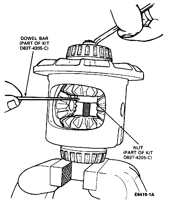 6. Insert Dowel Bar or equivalent, part of D83T-42O5-C, in hole of nut. Tighten forcing screw to force side gears away from the pinion mating gears. The dowel bar is used to keep the nut from turning when the forcing screw is tightened.