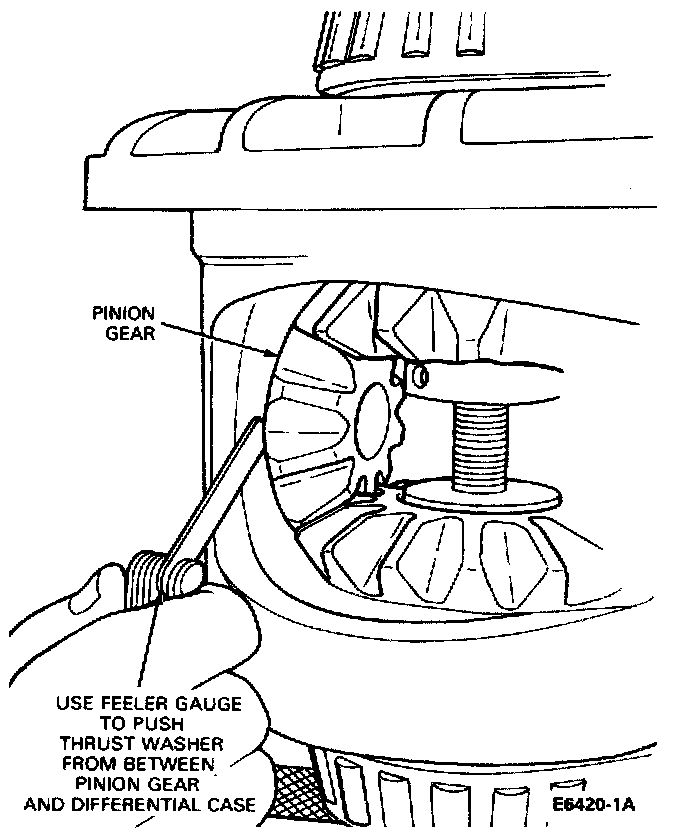 7. With an appropriate size feeler gauge, push the pinion gear thrust washers out from between the pinion gears and the differential case. Remove the thrust washers, then back off the forcing screw until it is loose (approximately one turn).