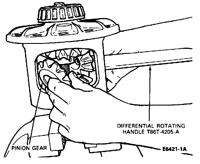 8. Insert Rotating Tool T86T-4205-A in the pinion shaft bore and turn the case to "walk" the pinion gears out to the differential case windows. Remove the pinions.