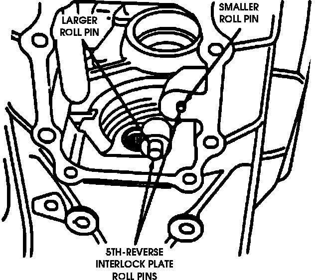 9. Remove roll pins retaining 5th/reverse interlock plate in their bores just below gearshift housing.
