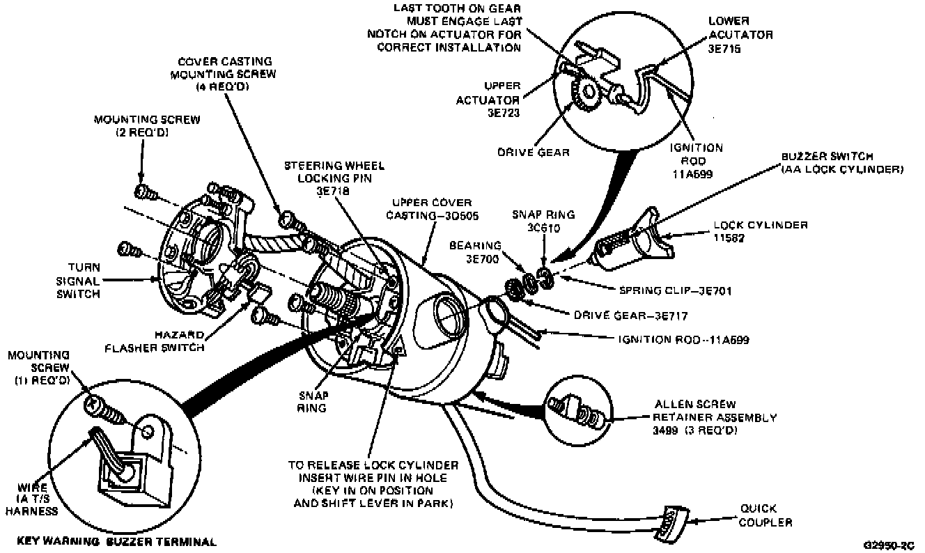 3. Remove the snap ring, washer and lock drive gear from the lock cylinder housing. Note the position of the drive gear to the rack teeth.