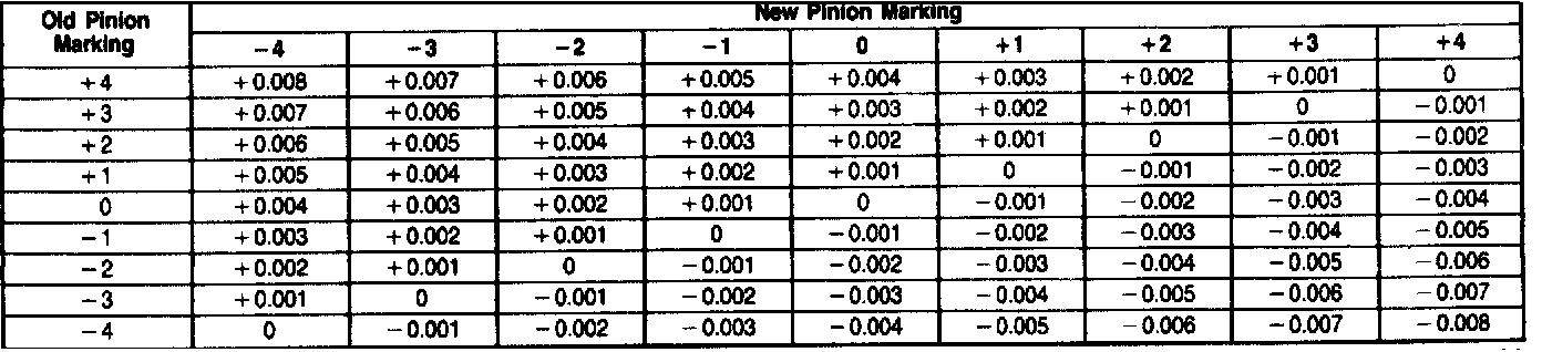 For example-If the old pinion reads m+5 (+2) and the new pinion is m-5 (-2), add 0.10mm (0.004 inch) shims to the original shim pack.