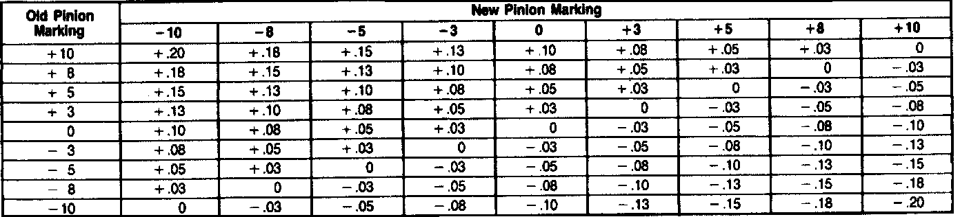 If a new gear set is being used, notice the + or - etching on both the old and new pinion and adjust the thickness of the new shim pack to compensate for the difference of these two figures.