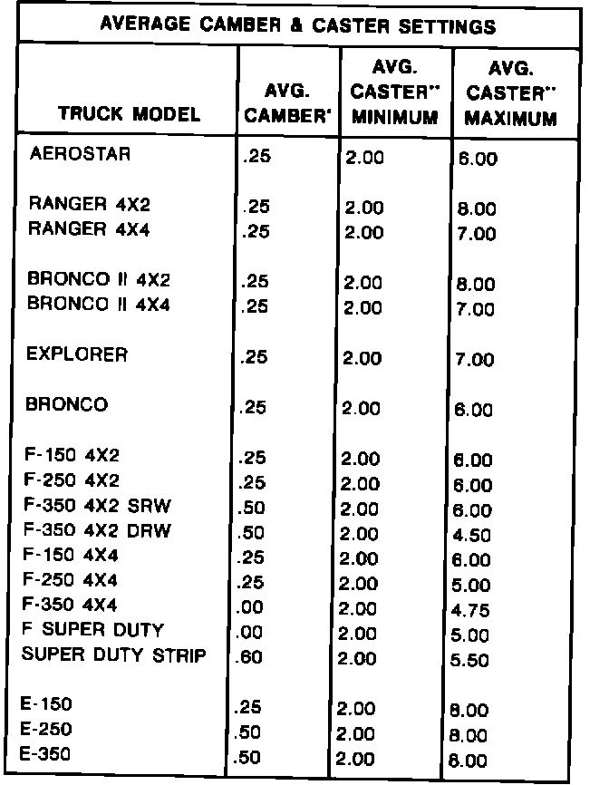 ^ Vehicles operated below the minimum average caster value shown may result in wander and poor steering returnability concerns.