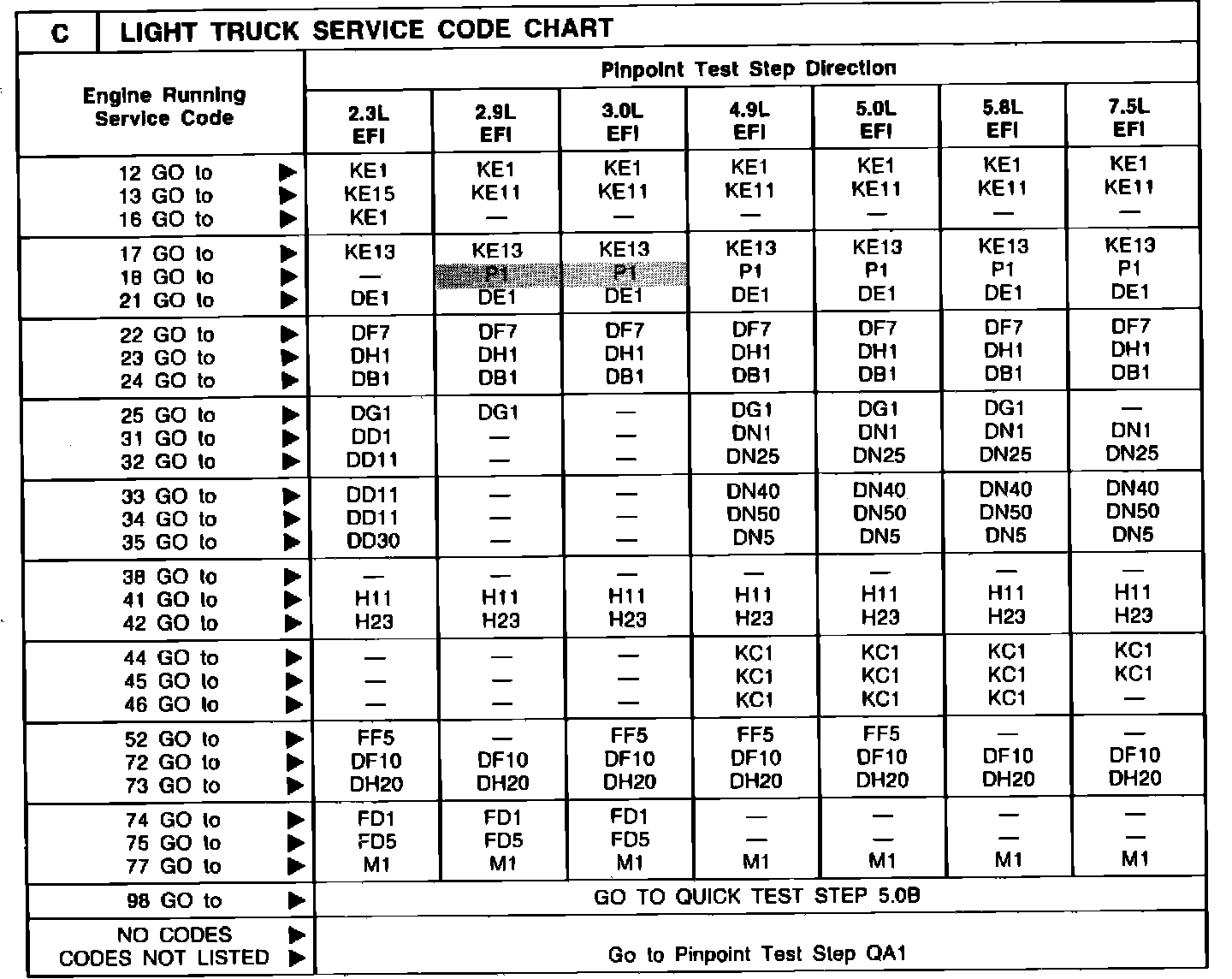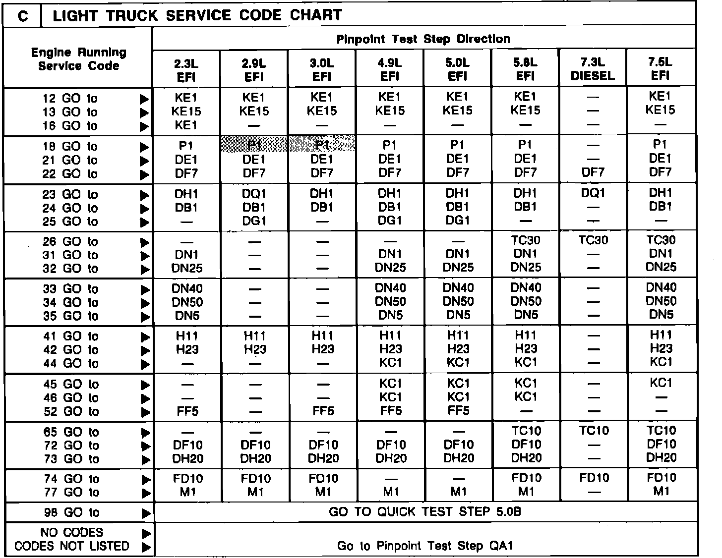 ISSUE: The Key On Engine Running Self-Test Code 18 does not indicate a "P1" Pinpoint Test Step Direction for 2.9L EFI and 3.0L EFI engines in the charts on page 16-13 of the 1988 Volume H and page 14-15 of the 1989 Volume H.