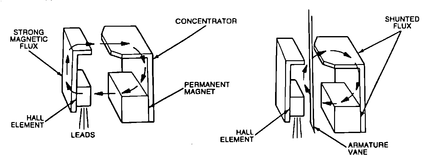 In other words when one of the windows or openings is in the gap between the Hall device and the permanent magnet, the field stays strong and the voltage is high since the magnetic path is complete from the magnet, through the Hall device, and back to the magnet. In this case the switch is off and the Hall Effect does not send a signal. When the TAB enters the gap, the armature cuts off the magnetic path to the Hall device and its voltage drops. In this case the switch is on and the Hall Effect device sends a signal. The signal is switched On and Off as long as the armature is rotating (distributor is turning) and opening and closing the magnetic path.