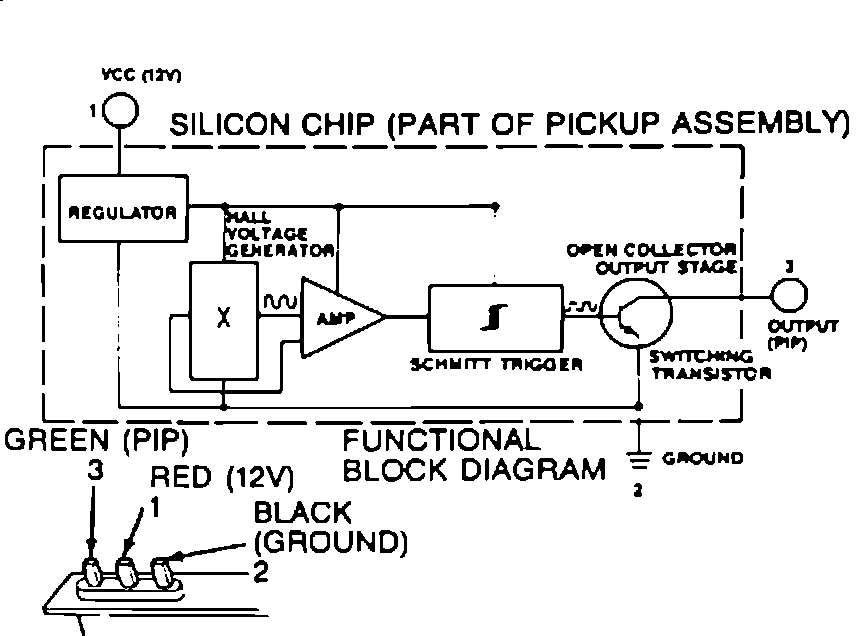 The Hall Effect device is made up of a voltage regulator, a Hall voltage generator, Darlington amplifier, Schmitt trigger, and an open collector output stage integrated in a single monolithic silicon chip. A signal is produced when a ferrous material is passed through the opening and the flux lines decrease.