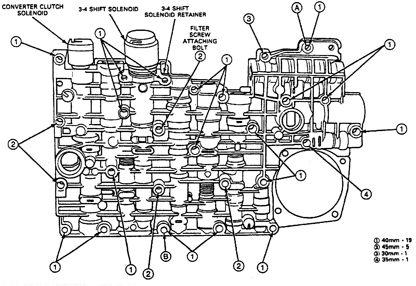 c. Insert remaining bolts, except filter and 3-4 shift solenoid retainer bolts, and torque to 71-97 in lbs.