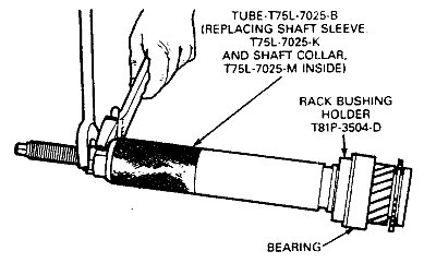 1. Position a new bearing on the input shaft and press the bearing onto the shaft using Tube, T75L-7025-B, Replacing Shaft Sleeve, T75L- 7025-K, Shaft Collar, T75L-7025-M and Rack Bushing Holder, T81P-3504-D (or an appropriate size washer).