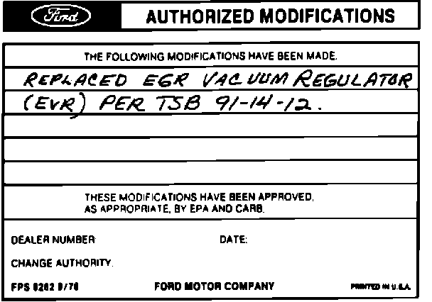Obtain an Authorized Modifications Decal and list the date, dealer number, and summary of alterations performed. Select a prominent place adjacent to the Vehicle Emission Control Information Decal suitable for installing the Authorized Modifications Decal. Clean the area, install the decal, and cover it with a clear plastic decal shield.