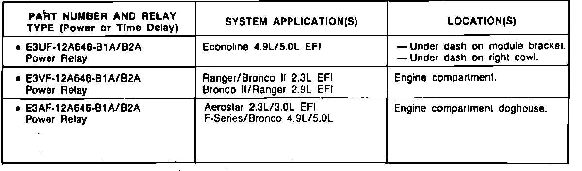 EEC power relays are in parallel with ignition switch and provides power to the EEC module. Power relays also provide reverse battery protection and increased load handling to improve ignition switch reliability. Refer to Figs. 12 & 12a, for EEC-IV power relay type, location and model/engine applications.