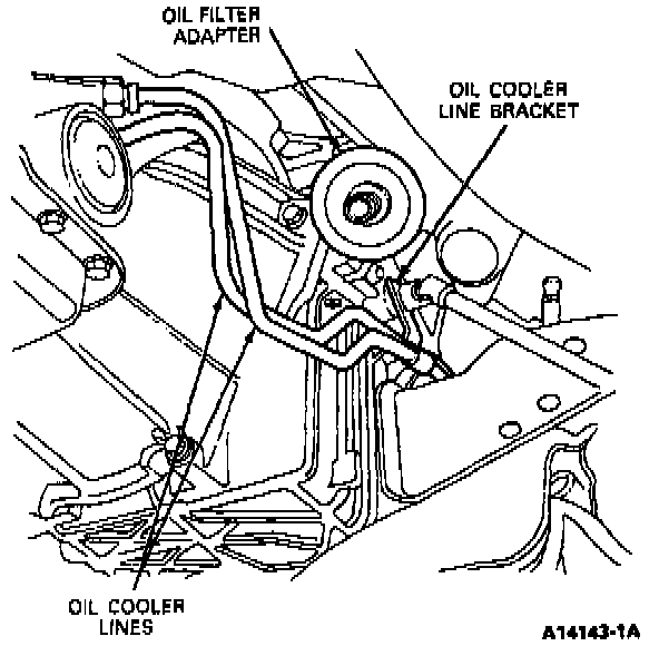 8. Position a drain pan, disconnect and remove the transmission oil cooler.