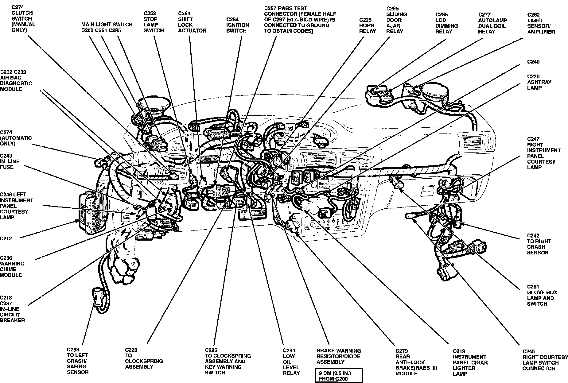 Behind LH side of Instrument Panel, taped to Main Harness near C296.