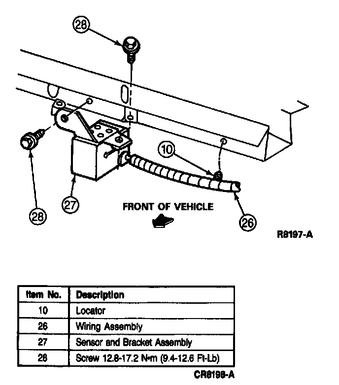 1. Position front center sensor and wire lead in vehicle and secure sensor to center radiator support with retaining screws. lighten screws to 10.2-13.8 N.m (7.6-10.1 lb-ft).