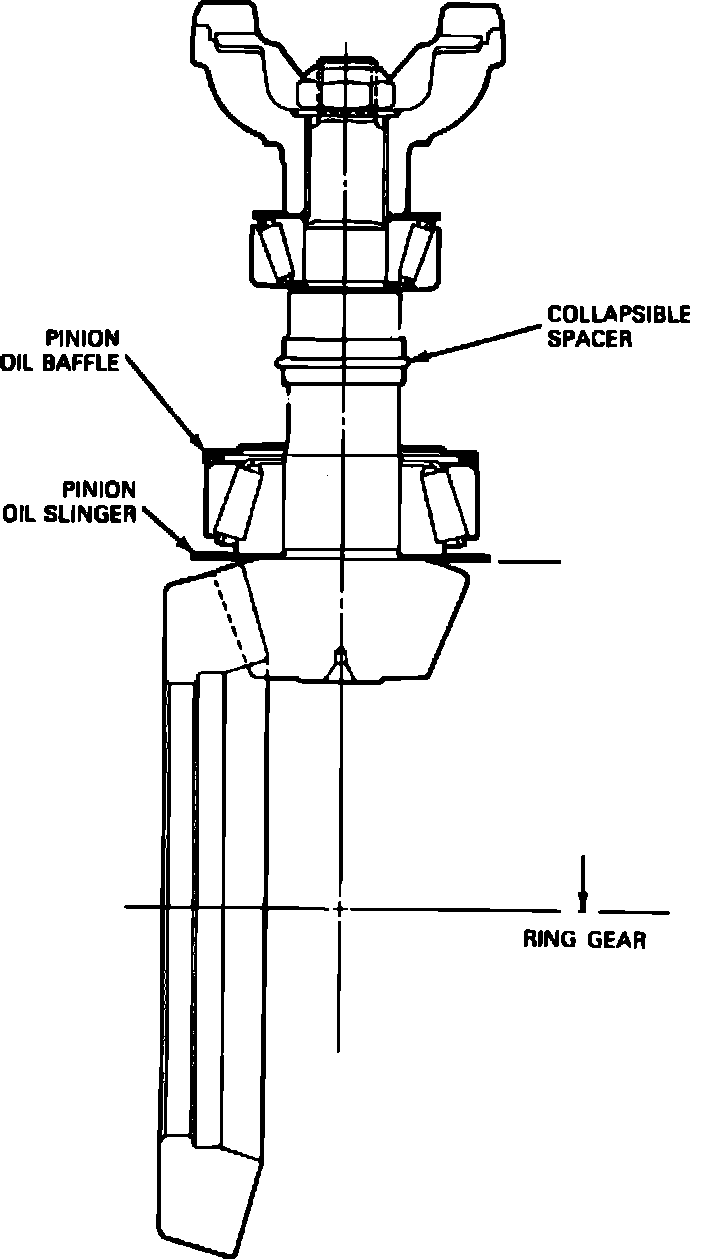 Pinion depth is controlled by a selective thickness oil slinger located between drive pinion head and inner pinion bearing cone and an oil baffle located between inner bearing cup and carrier bore, Fig. 5.