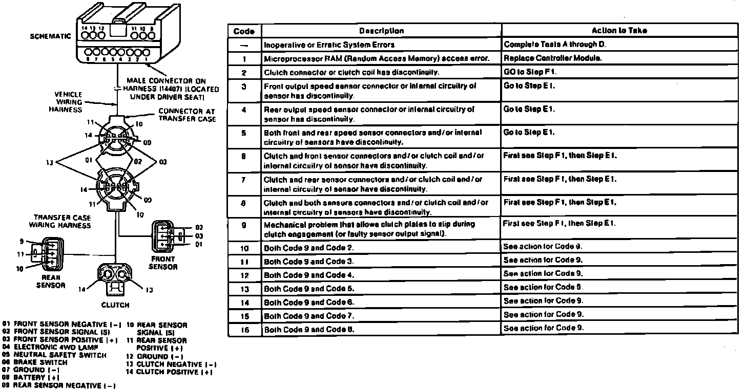 The electronic four-wheel drive system also includes the brake switch input, neutral drive switch input, one power and two ground lines, along with the E4WD lamp. If ignition is turned off and code is lost, the ignition will have to be turned on again to regenerate Codes 1 through 8, if condition or conditions still exist. To regenerate Codes 9 through 16, the vehicle must be driven again.