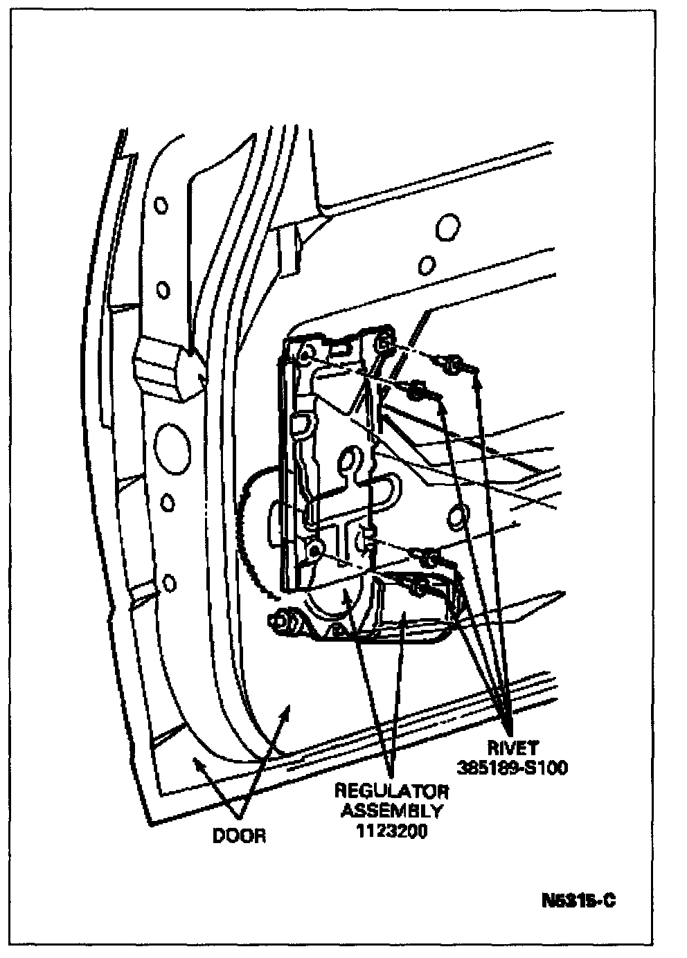 6. Push the motor toward the outside sheet metal to disengage the motor and drive from the regulator gear. After the motor and drive are disengaged, prop the window in full up position.