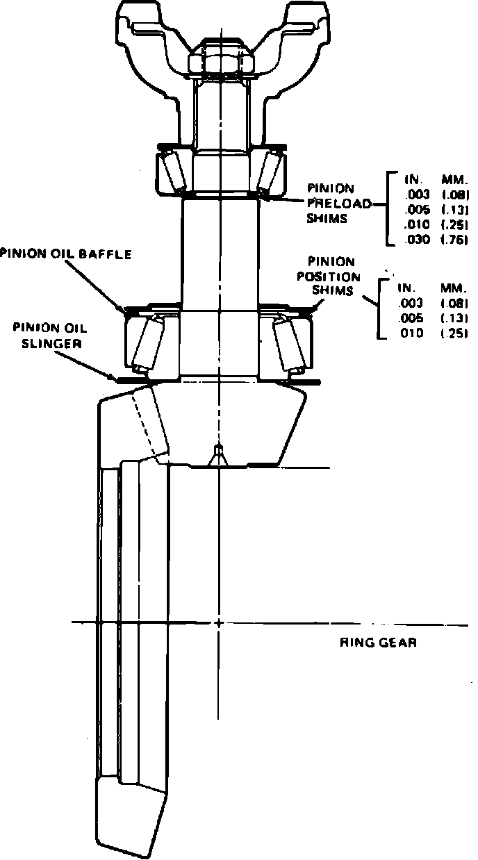 Pinion depth is controlled by a pinion locating shim pack installed between drive pinion inner bearing cup and carrier housing, Fig. 16. This shim pack and inner oil slinger and oil baffle controls the position of the pinion. Adding shims moves pinion toward ring gear and removing shims moves pinion away from ring gear.