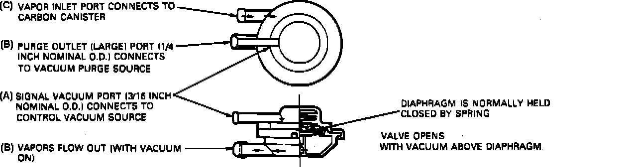 This purge control valve is normally closed by spring pressure above the internal diaphragm, and blocks fuel vapors from entering the intake manifold. The valve is located in-line between the canister and a vacuum port on a fitting at the throttle body or at the PCV valve connection.