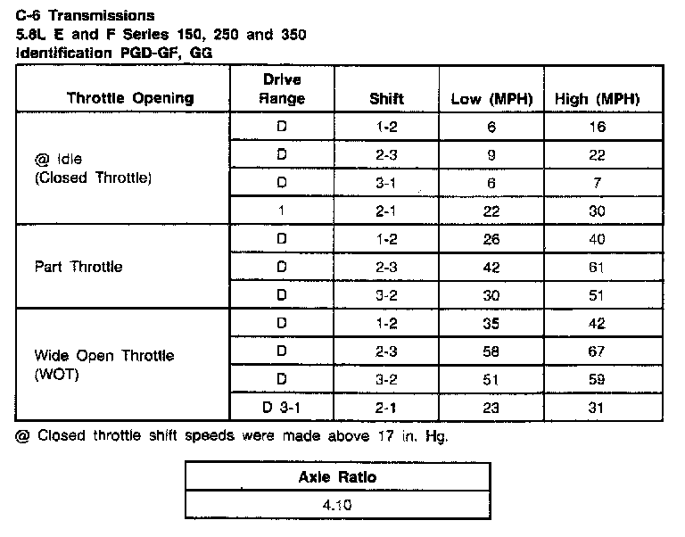 C6 3-spd A/T, Shift Speeds (5.8L E/F Series, 150/250/350):