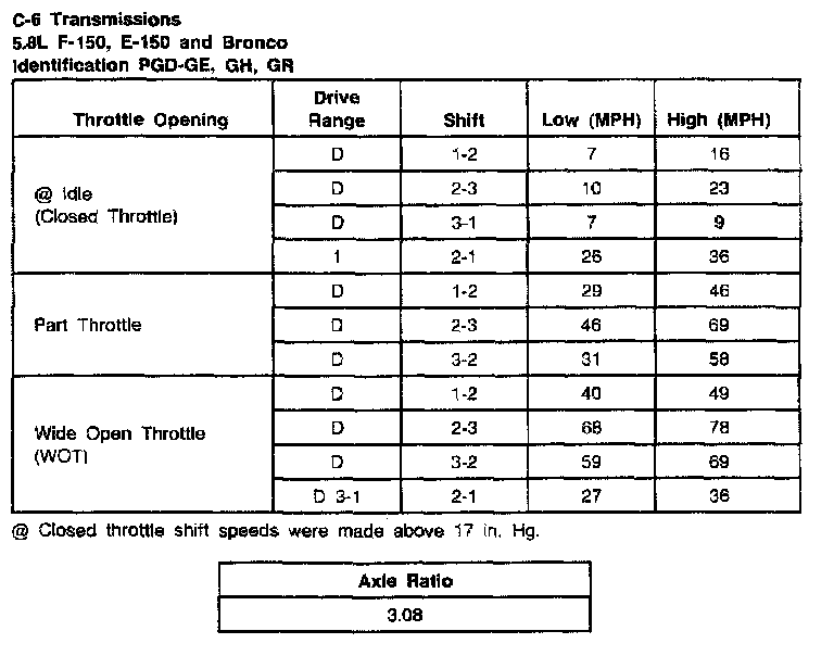 C6 3-spd A/T, Shift Speeds (5.8L F-150, E-150, Bronco):
