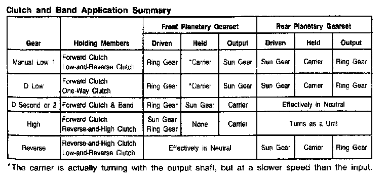 C6 3-spd A/T, Clutch/Band Application: