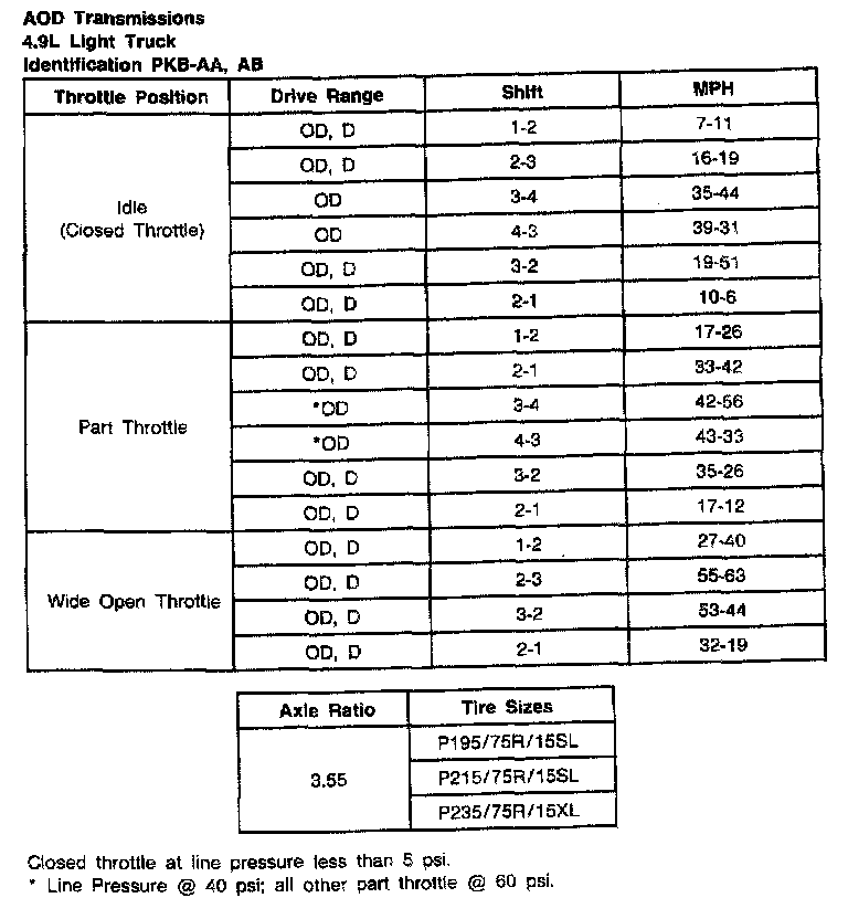 AOD 4-spd A/T, Shift Speeds (4.9L Lt.Trk):