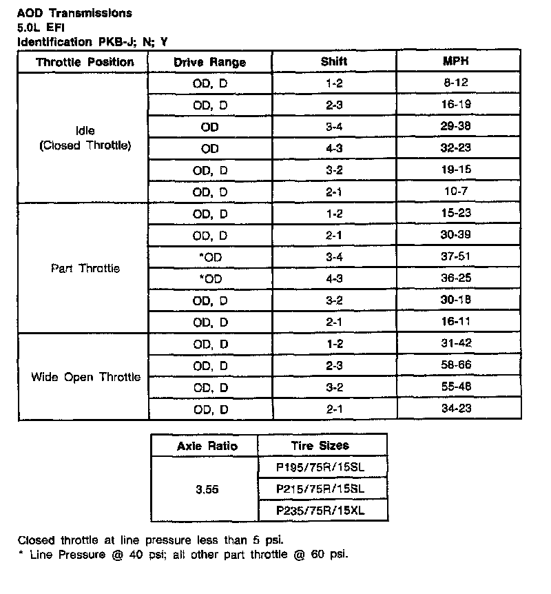 AOD 4-spd A/T, Shift Speeds (5.0L EFI):