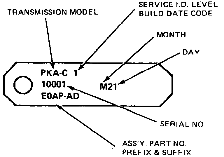 This transmission may be identified by the tag attached to the upper righthand extension housing to transmission case bolt. The tag includes model prefix and suffix, a service identification number, and a build date code. The service identification number indicates changes to service details which affect interchangeability when the transmission model is not changed.