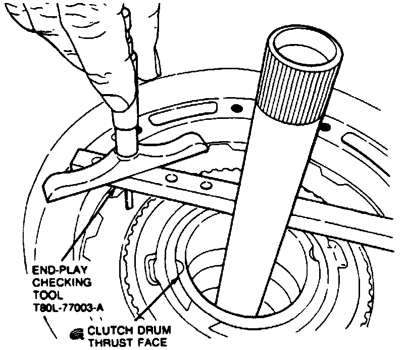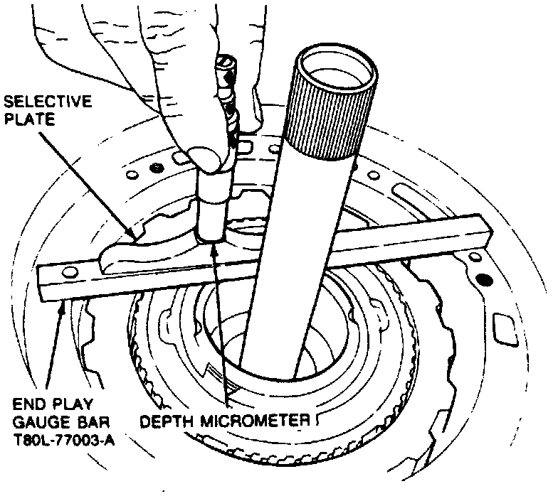 22. Measure depth at reverse clutch drum thrust face, then measure again 180° opposite to obtain average measurement. Determine selective thrust washer required.