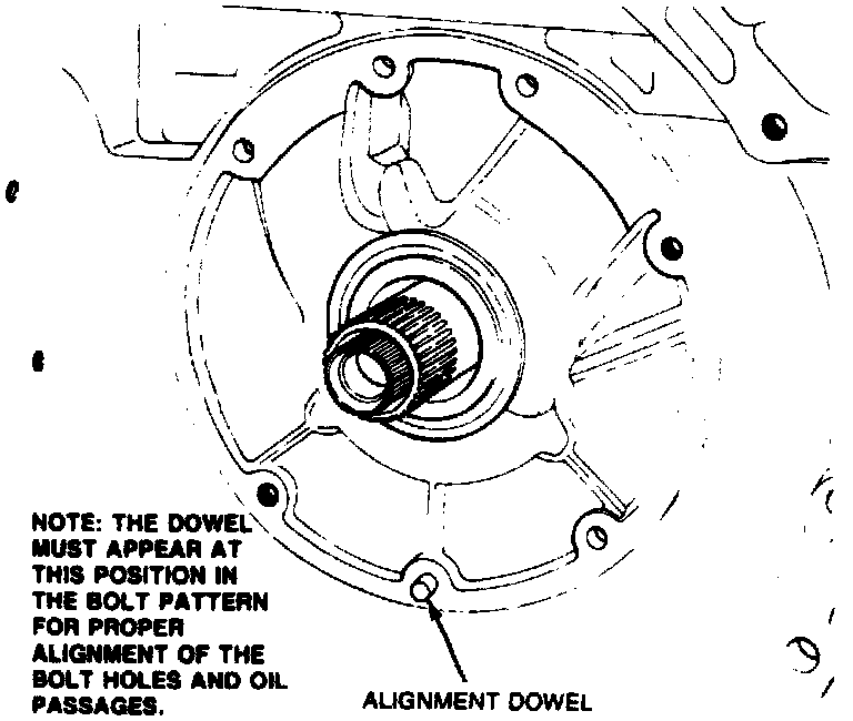 27. Remove alignment dowel and install pump attaching bolts, tighten alternately a few turns at a time to specification.