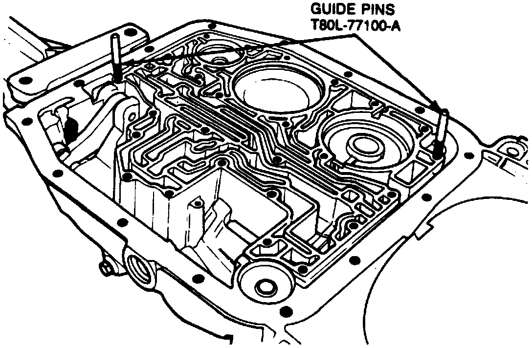 30. Install valve body guide pins T80L-77100-A or equivalents.