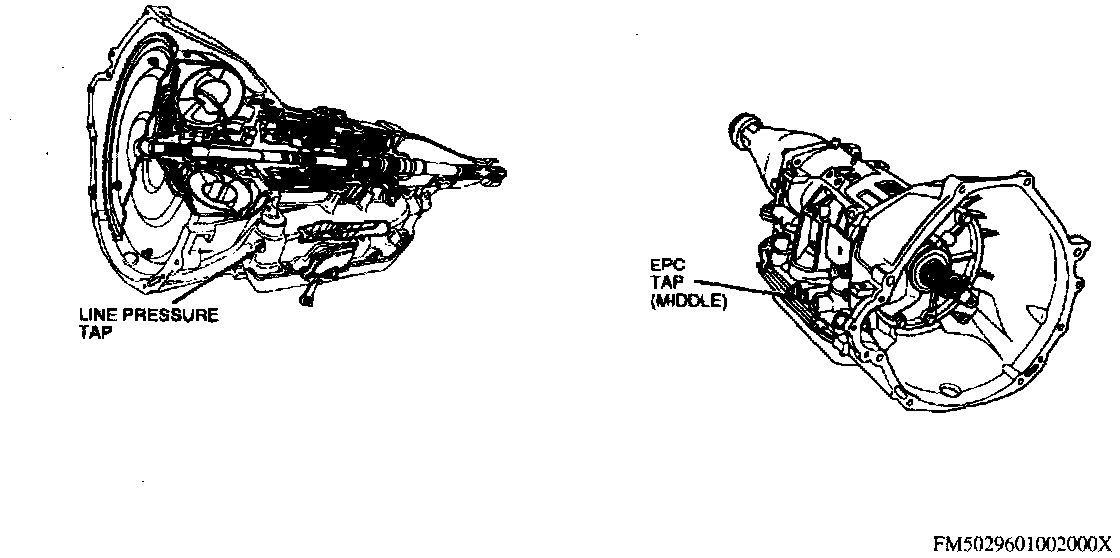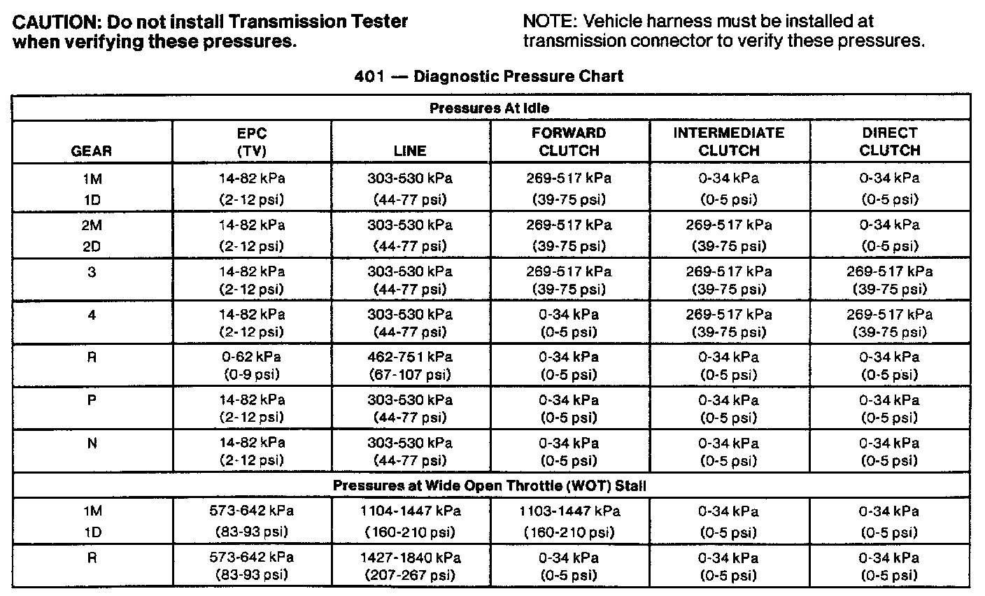 LINE PRESSURE TESTCAUTION: Perform the line pressure test prior to the stall speed test. If line pressure is low at stall, do not perform stall speed test, as transmission damage will occur. Do not allow engine to run at Wide Open Throttle (WOT) for more than 5 seconds.