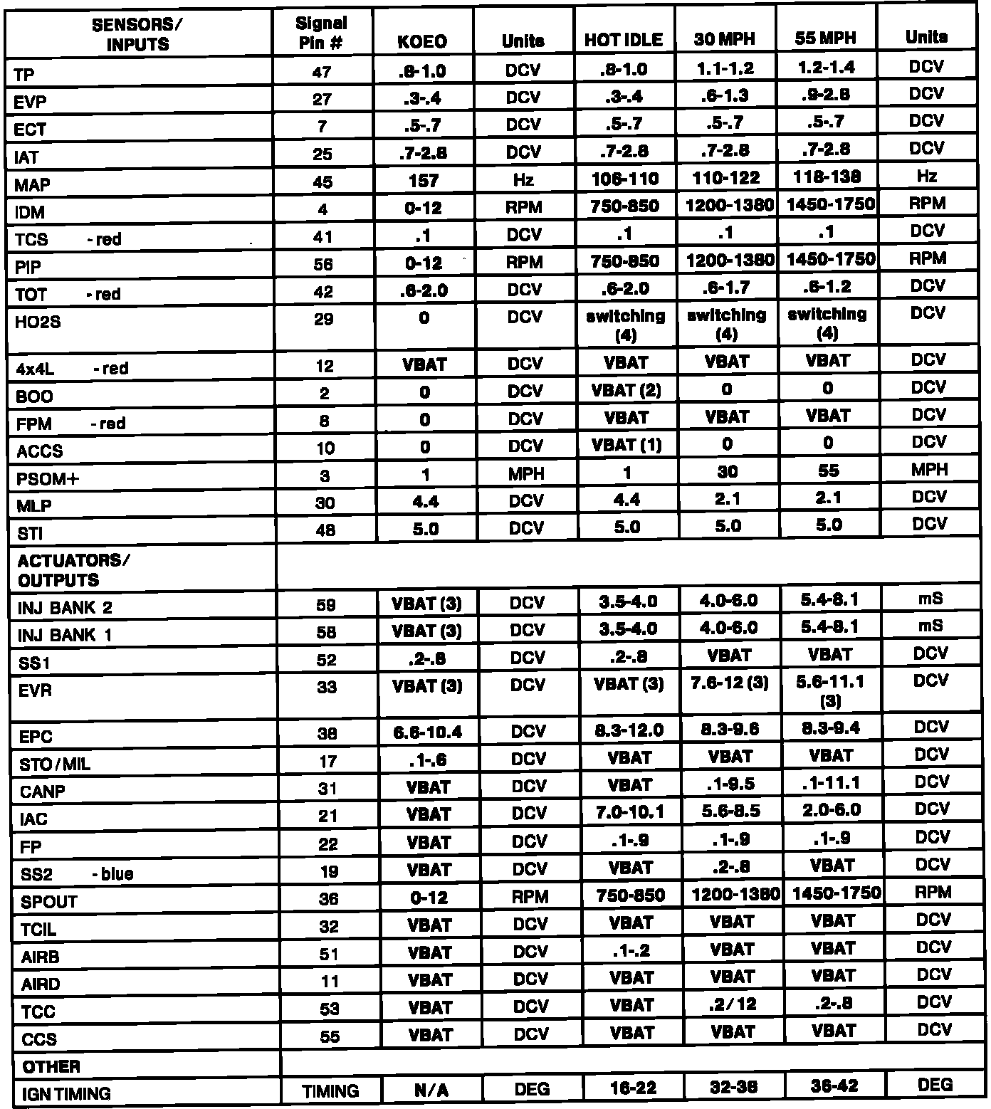 (4) -- HO2S should switch from rich (red LED) to lean (green LED), or lean to rich, at least once every 3 seconds. HO2S voltage should toggle above and below .450 DCV and should never be a negative value.