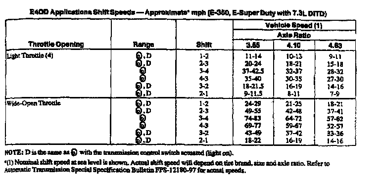 E4OD 4-spd A/T, Shift Speeds (7.3L DITD E-350, E-Super Duty):