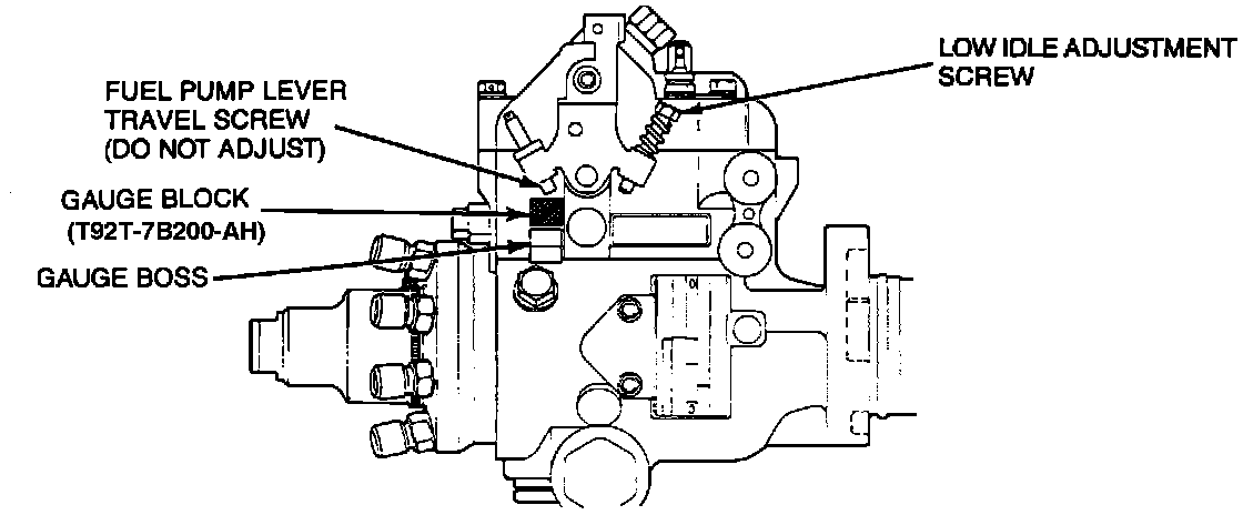 5. Insert the gauge block, T92T-7B200-AH between the gauge boss and the maximum throttle travel screw.