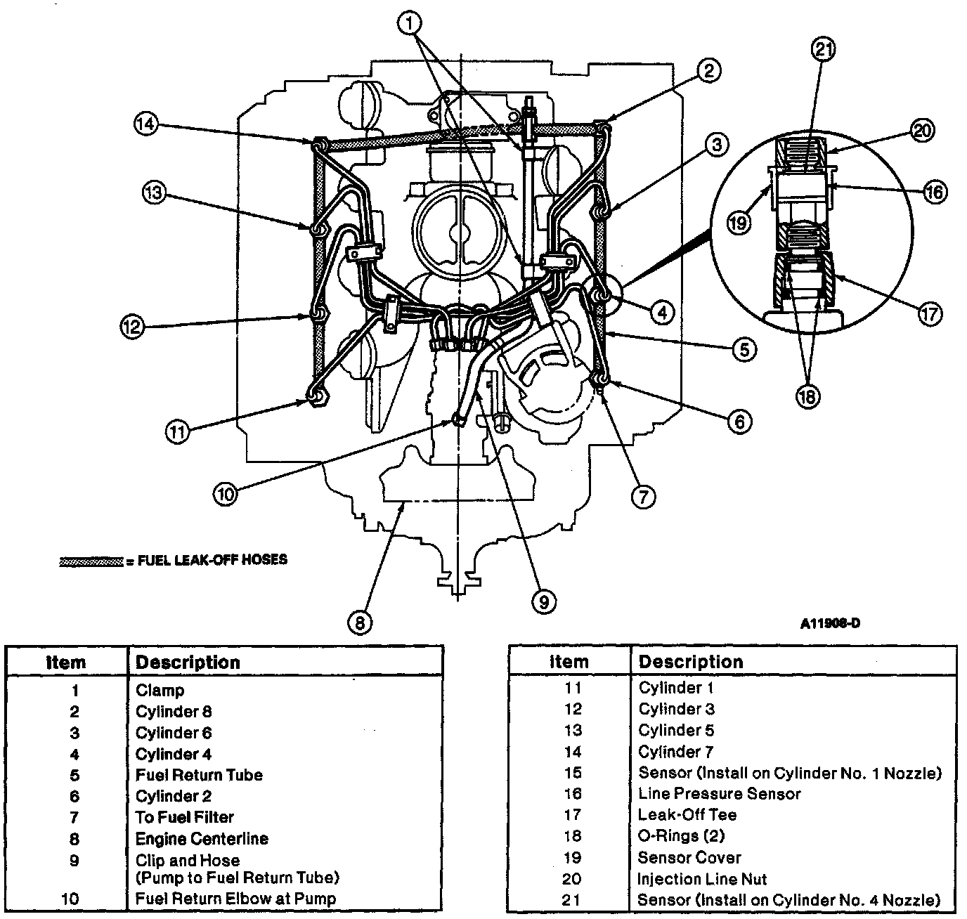 NOTE: Fuel lines must be removed following this sequence: 5-6-4-8-3-1-7-2. Install caps on each end of each fuel line and pump fitting as it is removed and identify each fuel line accordingly.