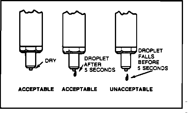 5. Check for tip leakage. Blow nozzle tip dry using filtered compressed air. Operate test pump to maintain pressure at about 1378 kPa (200 psi) below the opening pressure obtained in previous test. Wetting of the nozzle tip is acceptable as long as a drop does not fall within five seconds.