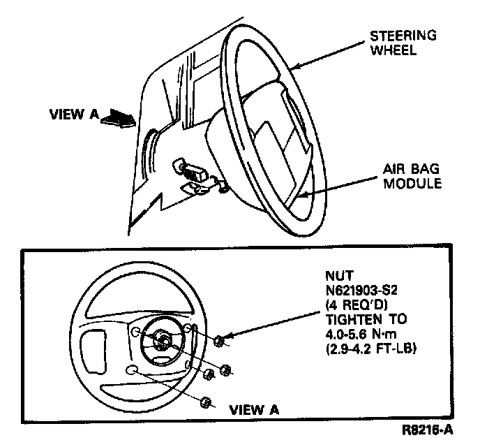3. Remove four nut and washer assemblies retaining driver air bag module to steering wheel. Disconnect driver air bag connector.