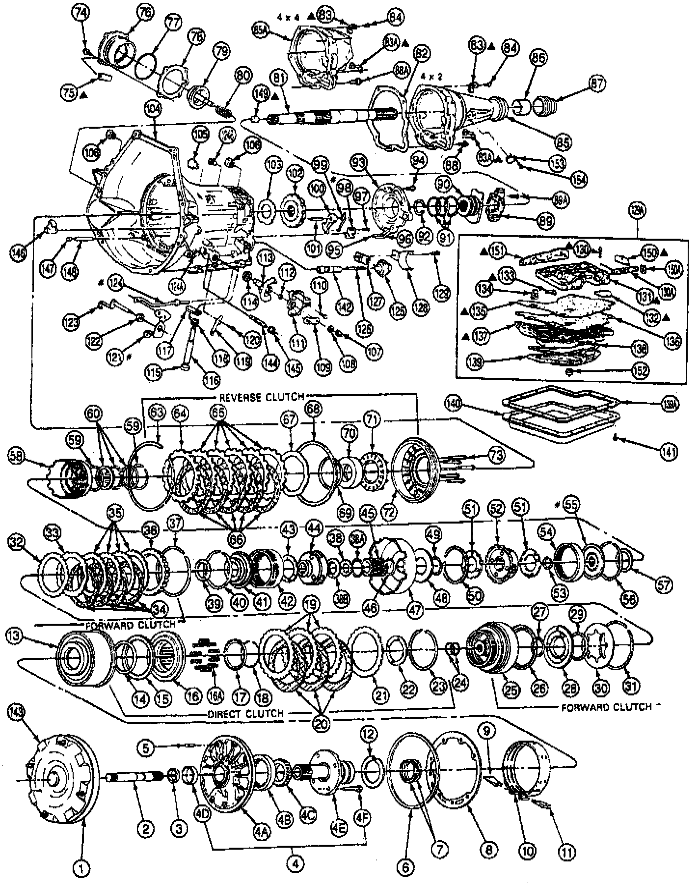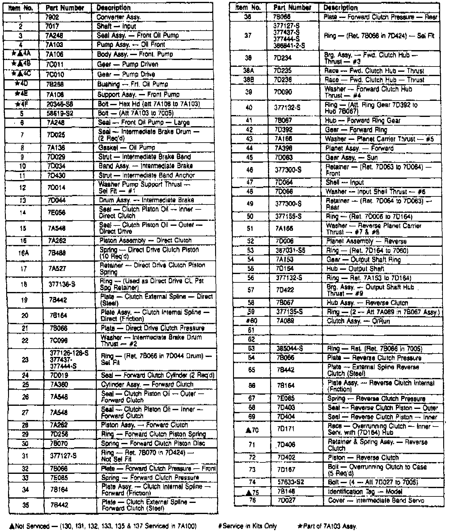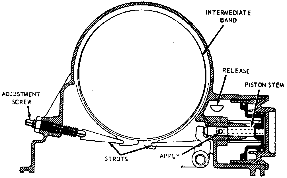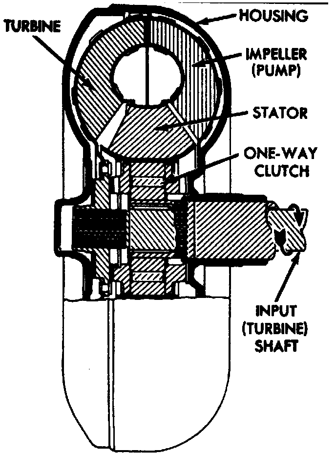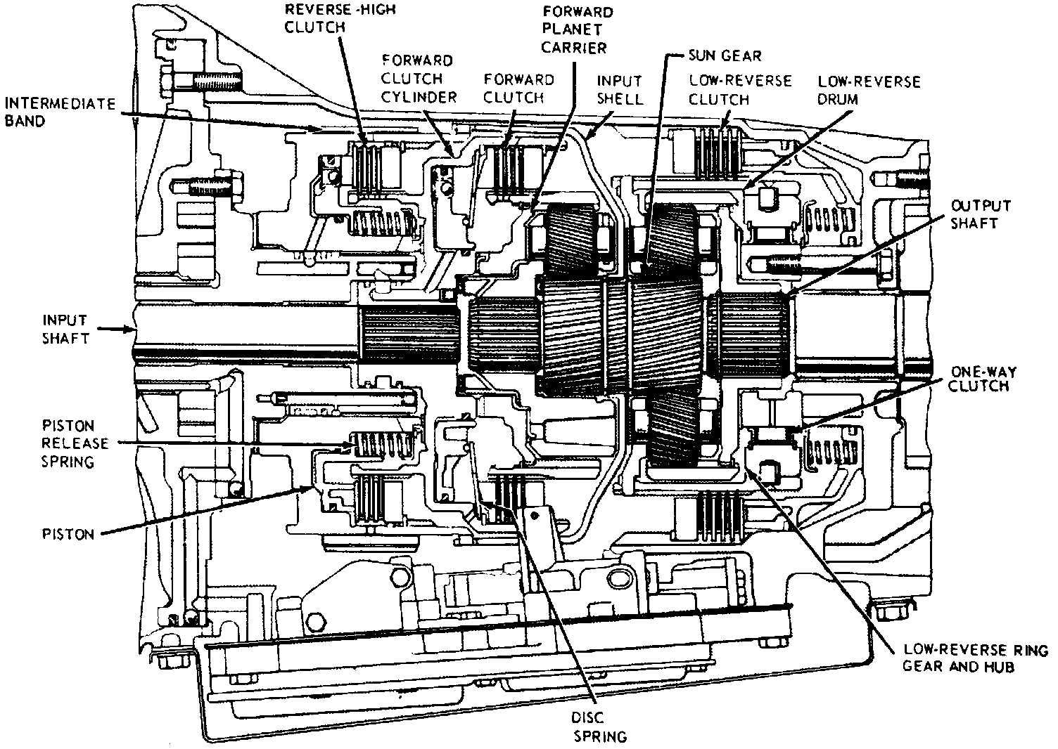 Refer to the Cross-sectional View Of Torque Converter image for the construction of the torque converter; the Gear Train, Clutches, And Band image for the construction of the gear train clutches and band; and the Intermediate Servo And Band image for the construction of the intermediate servo and band.