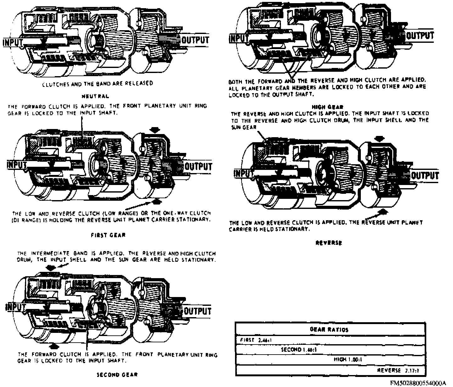 The flow of power in all ranges is shown in the Power Flow And Gear Ratios images.
