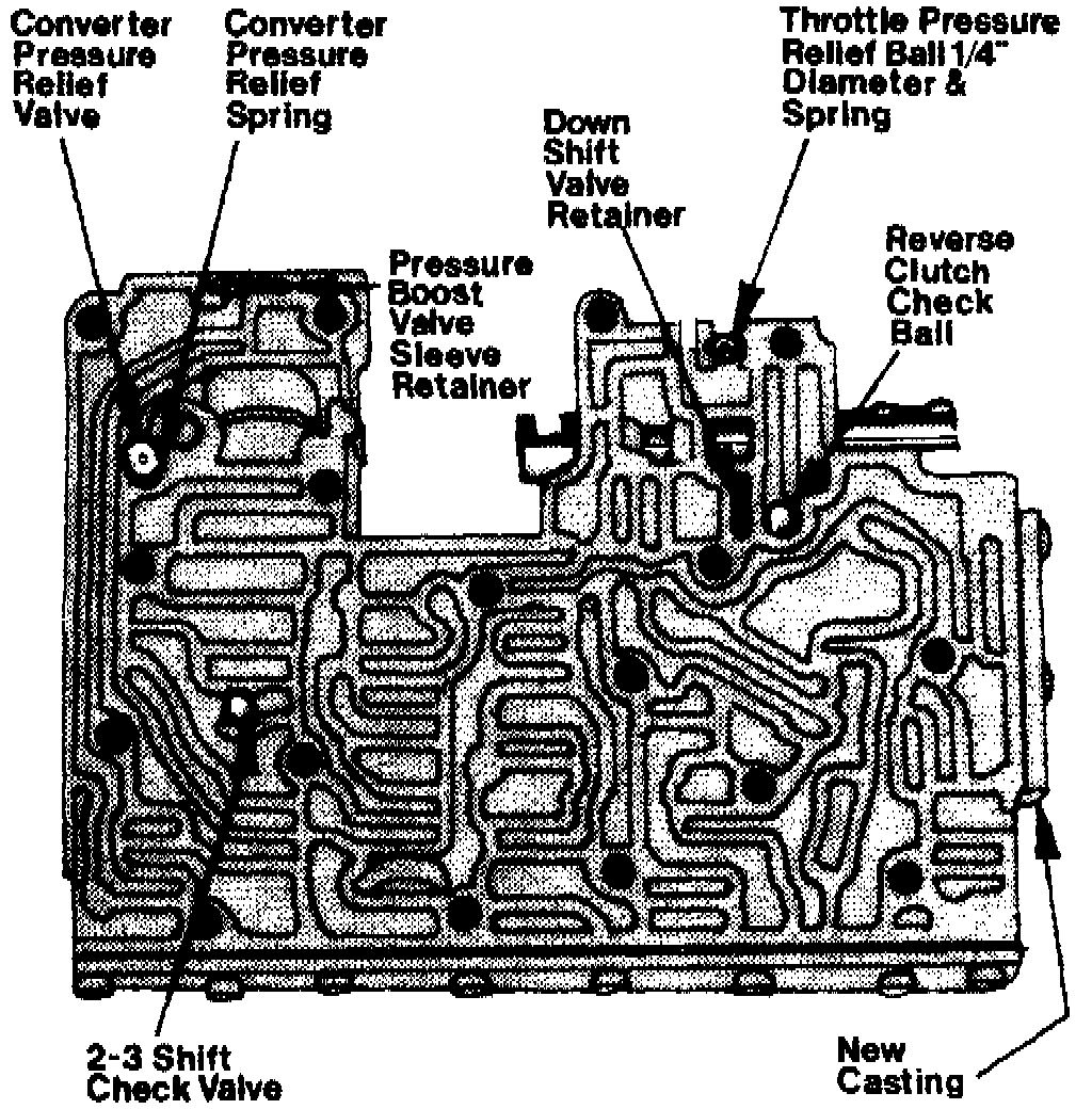 1. Reverse procedure to assemble the control valve. During the procedure, place the converter relief valve spring in its bore. Coat the check ball with petroleum jelly and place it on top of the spring. Place the 2-3 check ball in its cavity. Torque all screws and bolts.