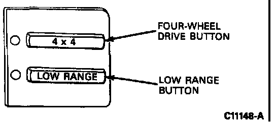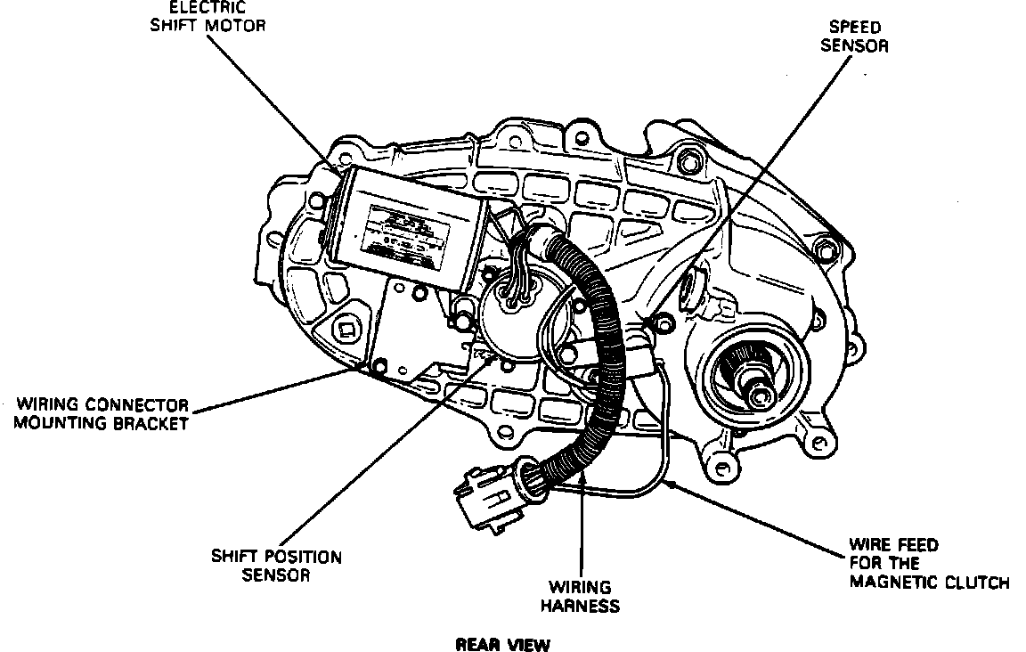 The transfer case is equipped with a magnetic clutch, similar to an air conditioning compressor clutch, that is located inside the transfer case adjacent to the 2W-4W shift collar. The clutch is used to spin up the front drive system from zero to vehicle speed in milliseconds. This spin-up allows the shift between 2-High (2H) and 4-High (4H) to be made at any vehicle speed. When the transfer case rear and front output shafts reach synchronous speed, the spring loaded shift collar mechanically engages the mainshaft hub to the chain drive sprocket and the magnetic clutch is then deactivated. Shifts between 4-High and 4-Low can only occur with the clutch interlock or transmission safety switches closed. The vehicle's speed must also be within specified limits as determined by the transfer case speed sensor (3 mph or under). When the operator selects the drive combination through the push-button control, an electric motor turns a helical cam, that is linked to the high-low and 2W-4W shift forks through fork mounted roller bushing assemblies. As the electric motor turns the helical cam, the high-low fork bushing rides in a slotted lobe in the cam to make the low-high or high-low range change and the 2W-4W fork bushing rides on lobes at the end of the cam to make the 2W-4W shift.
