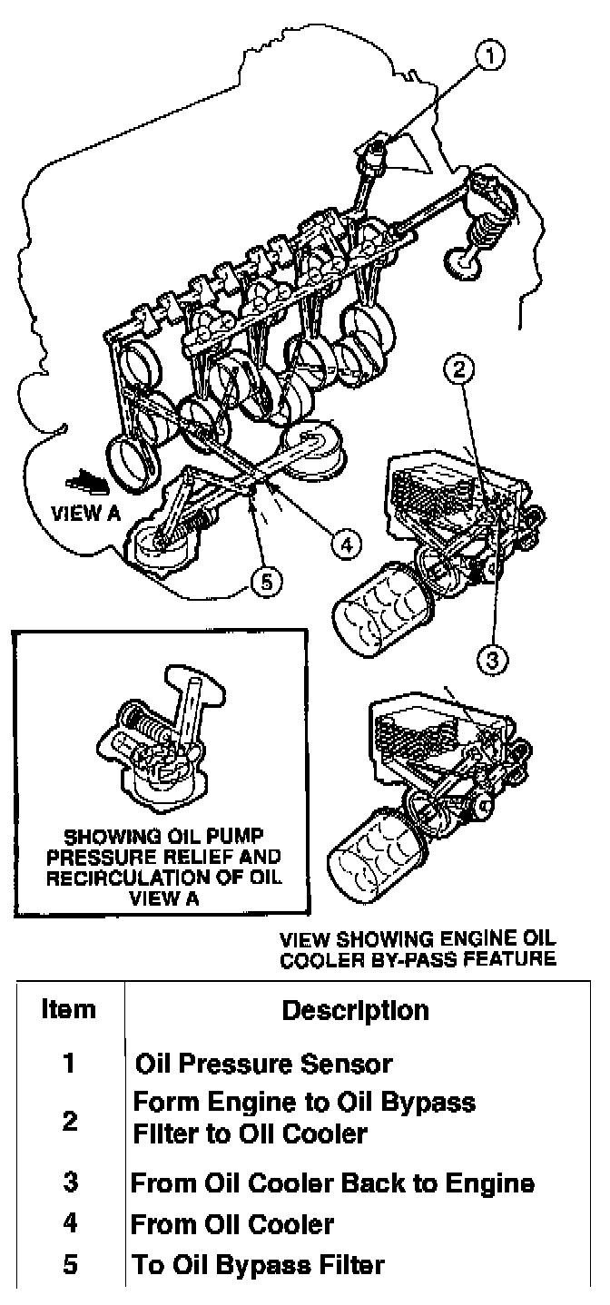 Pressurized oil from the oil pump is directed through a drilled oil passage to the full-flow oil filter and from the oil filter to main oil galleries intersecting the valve tappet guide bores. A drilled gallery (crossover) at the rear of the tappet chamber routes oil to the left bank. The crankshaft main bearings, connecting rod bearings, and camshaft bearings are supplied with oil from the right oil gallery.
