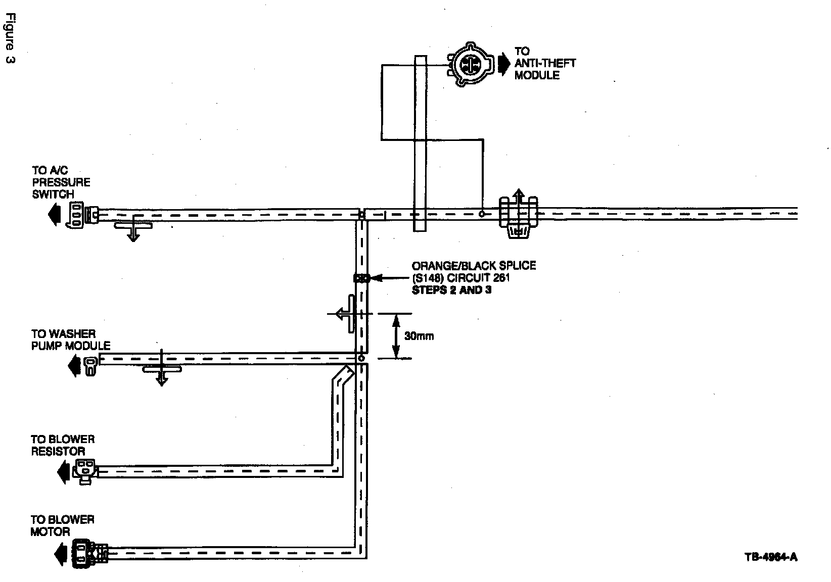 1. Disconnect the vehicle battery.2. Open the -12A581- wiring harness at the takeout (Figure 1) to the washer pump/blower motor/blower motor resistor and locate the Orange/Black splice (S148) with three (3) 12 gauge circuits (Figure 3).