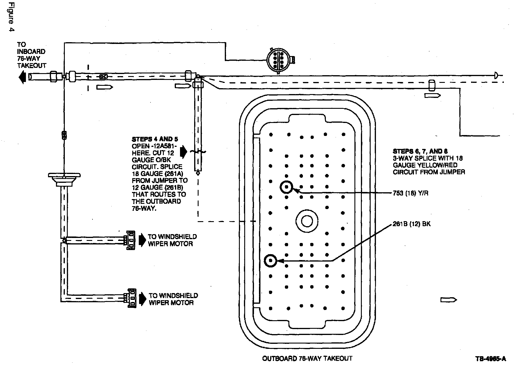 5. Take the end that continues on toward the driver's side of the vehicle and perform a one-on-one splice with the 18 gauge Orange/Black circuit (261 A) on the relay jumper assembly. Tape back the end that continues toward the passenger side of the vehicle (Figure 4).