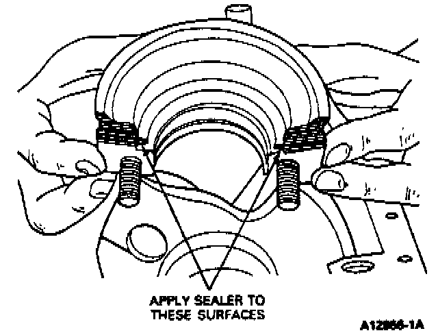 7. Place a bead of Loctite 515 sealer along the block corners of the rear main bearing cap joint area, and on the joint face approximately 1/2 inch from the rear of the block.