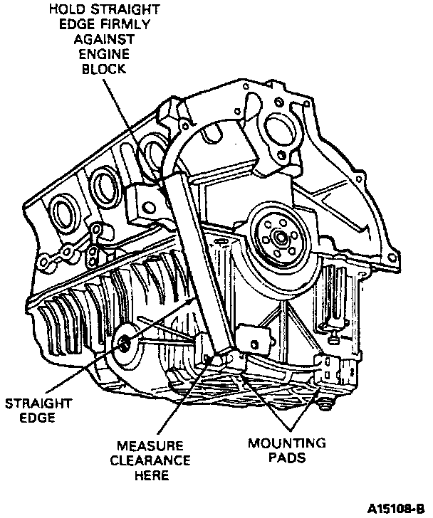 a. With the oil pan installed on the engine, position straightedge D83L-4201-A or equivalent flat on the rear of the engine block (as shown) so that it extends over one of the oil pan/transmission bolt mounting pads.