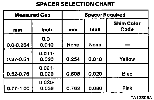 b. Using feeler gauge D81L-4201-A or equivalent, measure the gap between the mounting pad and the straight edge. Repeat the procedure for the other mounting pad. Select spacers of the required thickness from the chart.